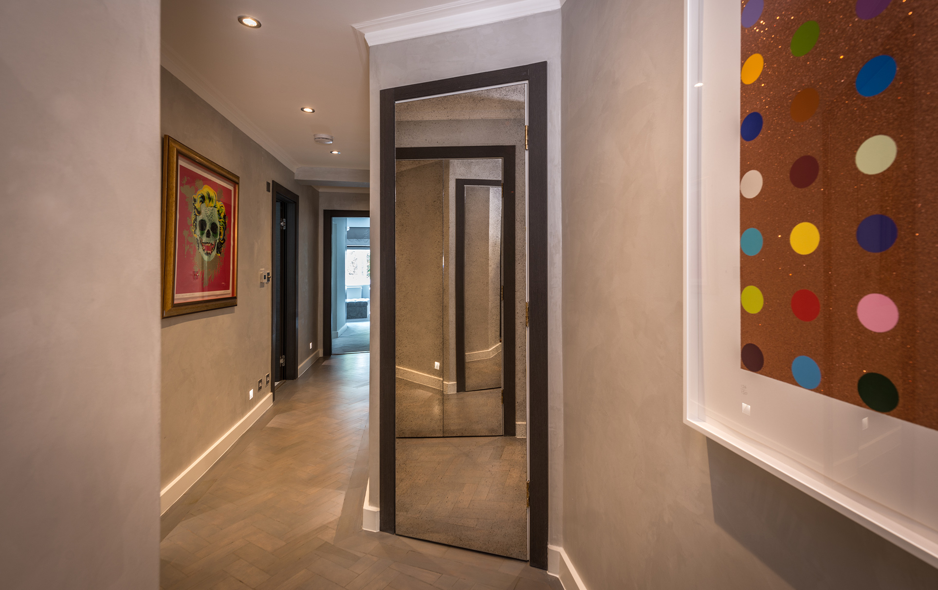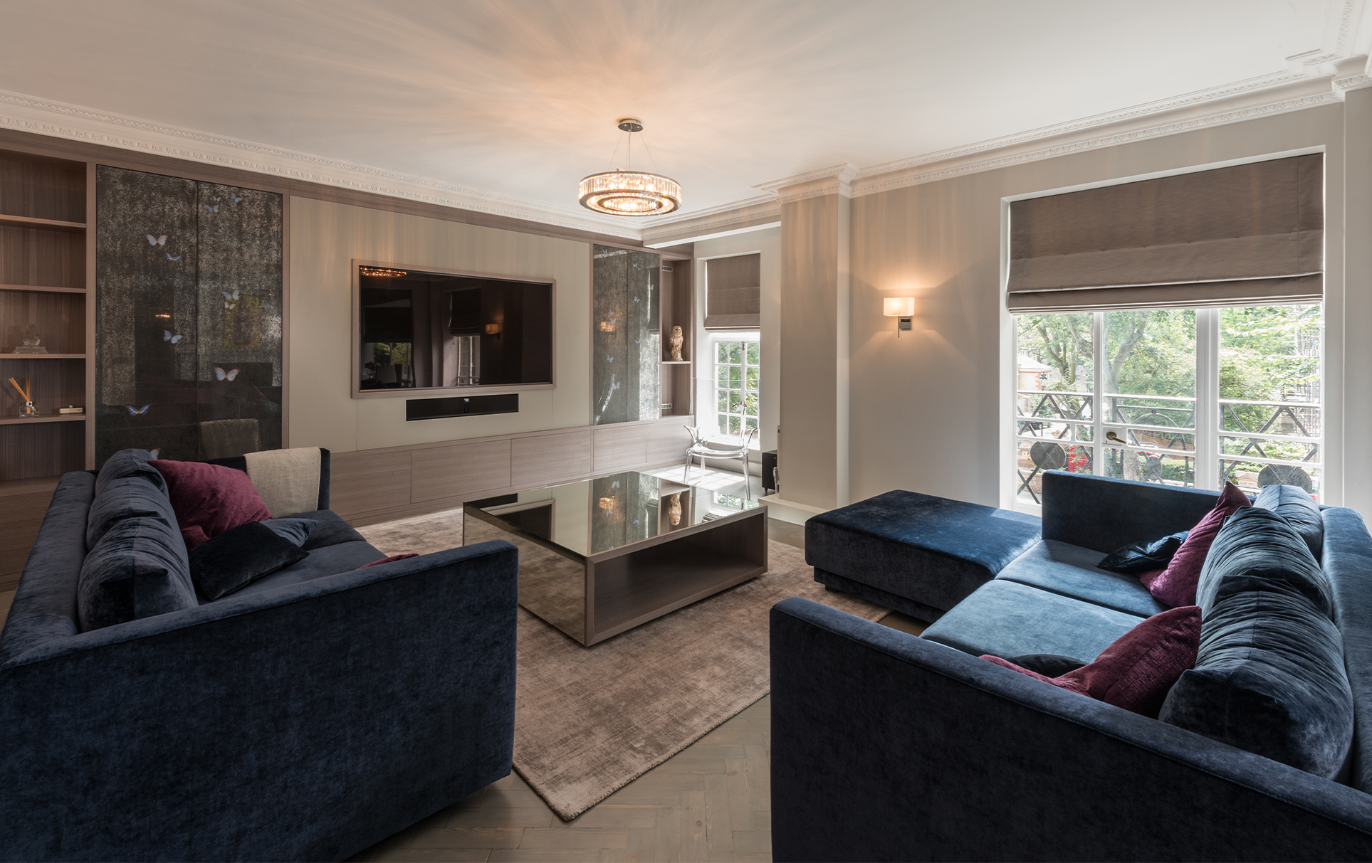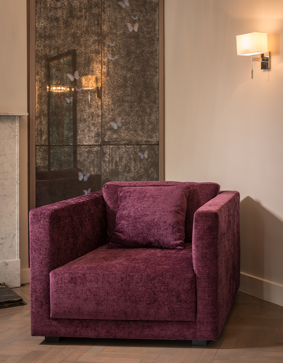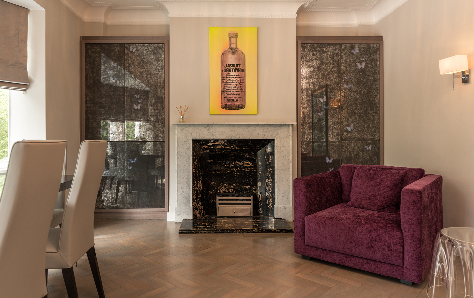 Tones of warm grey create a visual harmony throughout the whole apartment, and act as the perfect backdrop to showcase the client’s eclectic art collection. Plush velvet bespoke sofas and chairs provide luxurious comfort in classic colours. Bespoke grey sycamore fitted furniture add a seamless finish to the reception rooms. Personality and playfulness are revealed in custom-made antiqued glass cabinets, adorned with faithfully-reproduced butterflies.