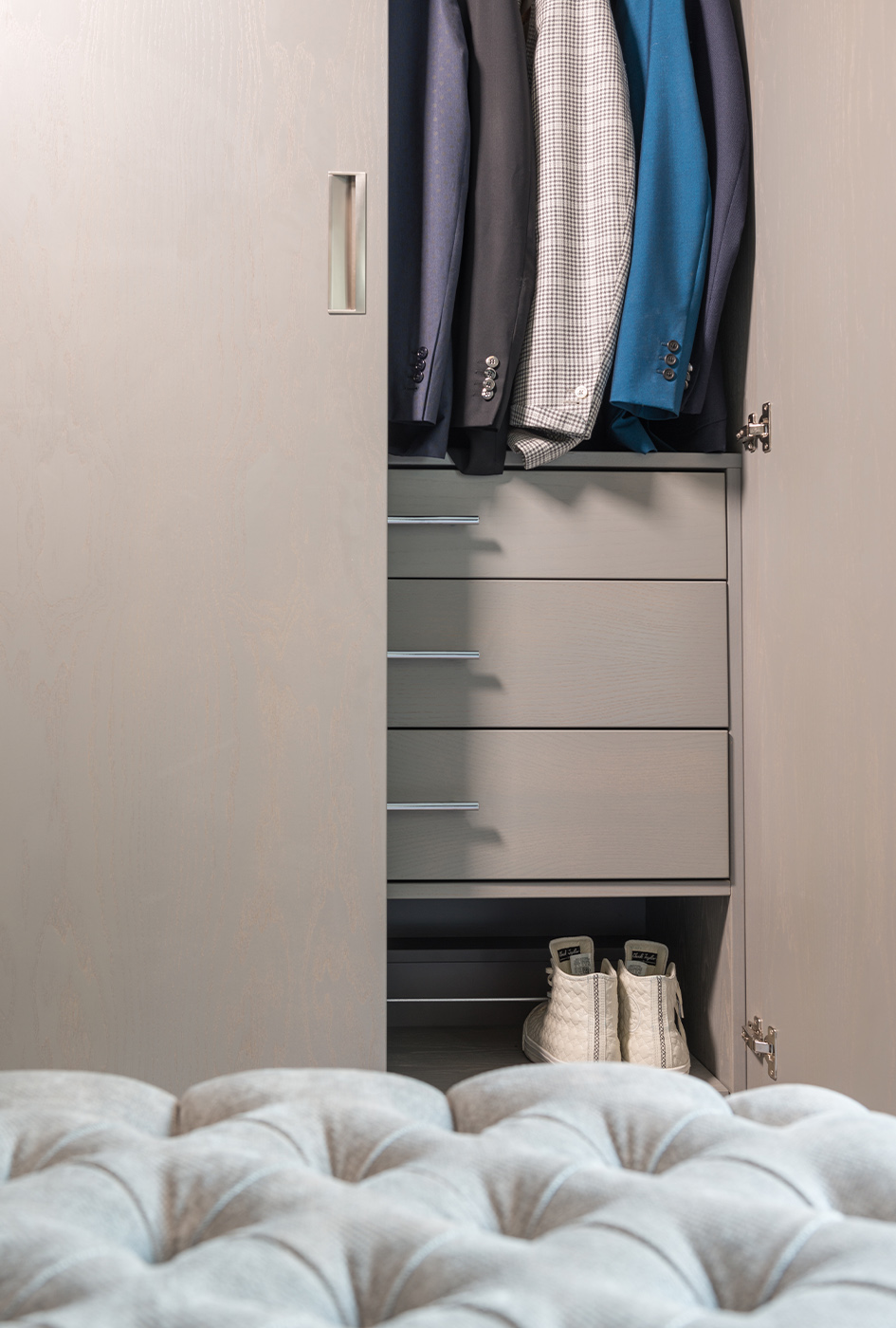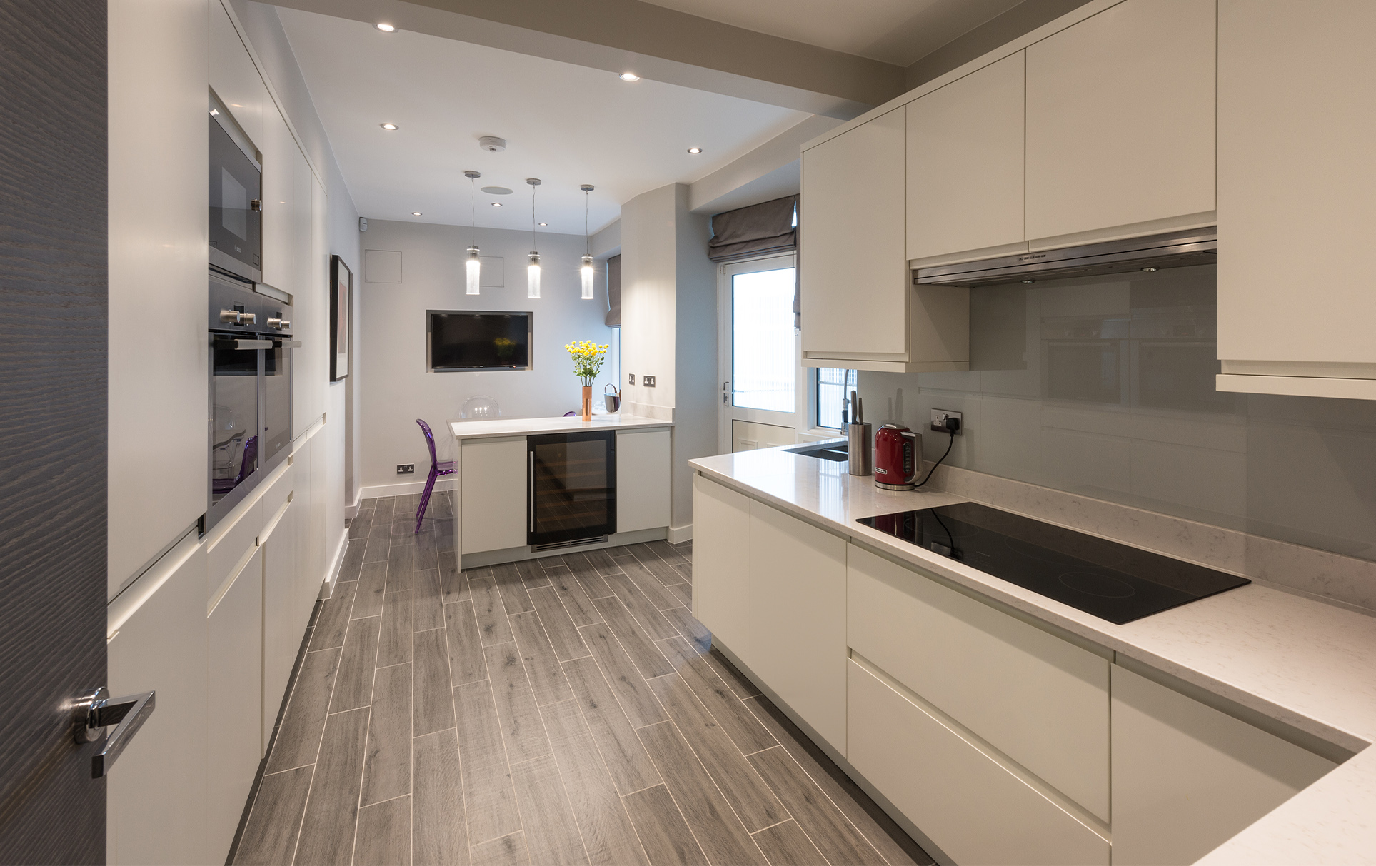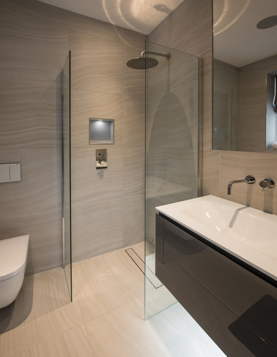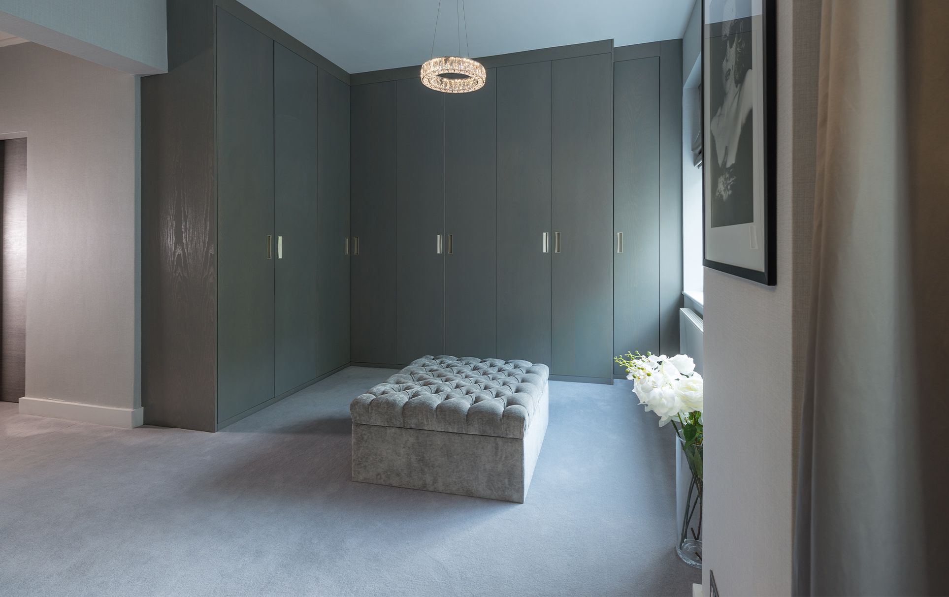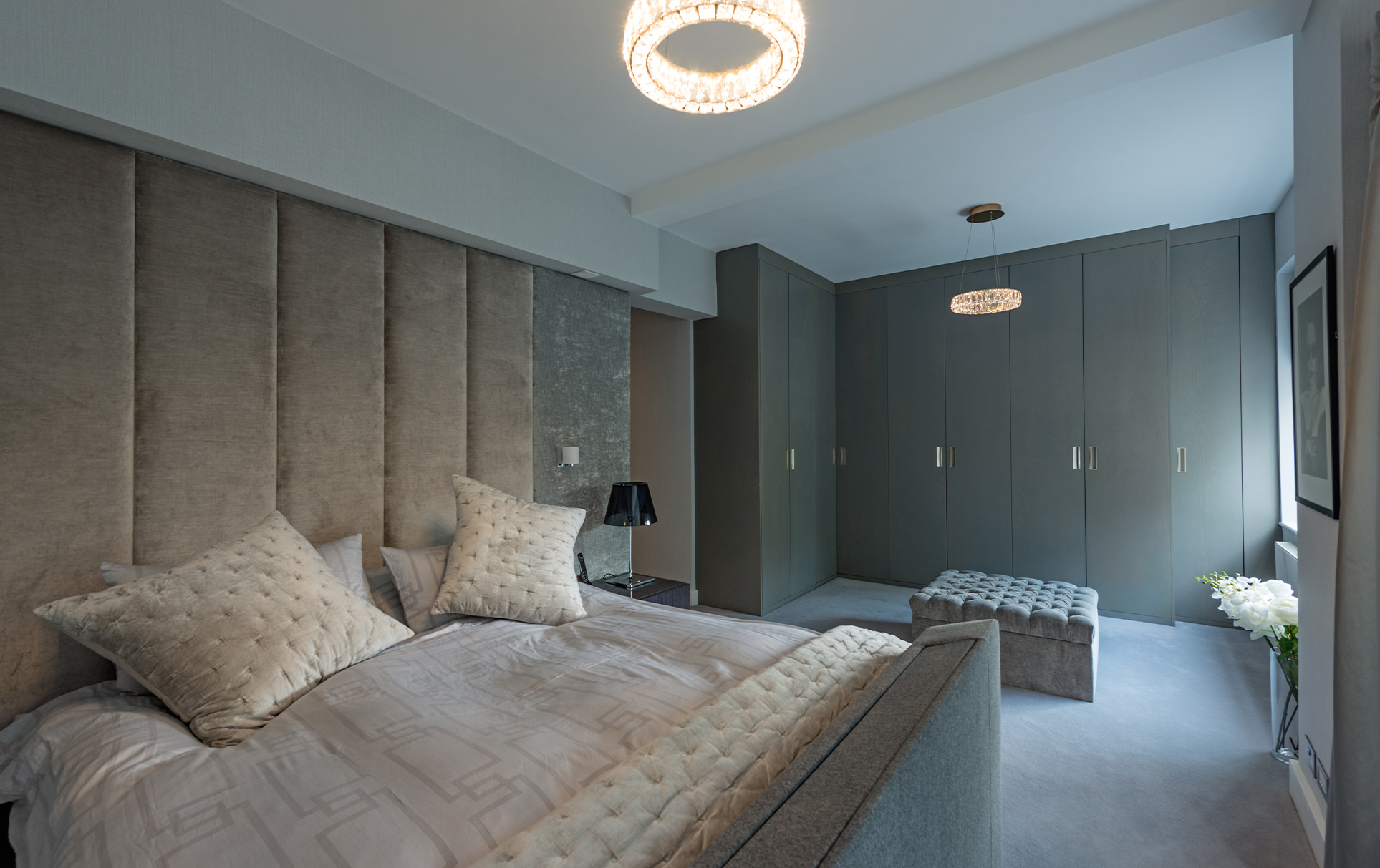 Tones of warm grey create a visual harmony throughout the whole apartment, and act as the perfect backdrop to showcase the client’s eclectic art collection. Plush velvet bespoke sofas and chairs provide luxurious comfort in classic colours. Bespoke grey sycamore fitted furniture add a seamless finish to the reception rooms. Personality and playfulness are revealed in custom-made antiqued glass cabinets, adorned with faithfully-reproduced butterflies.