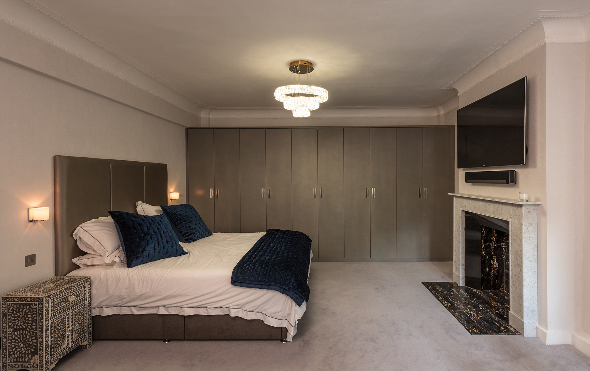 The bedrooms are sumptuous, featuring tailored headboards and fitted furniture. The second bedroom boasts a fireplace with calacatta surround and portoro inset.