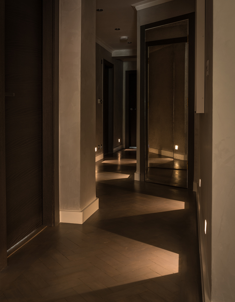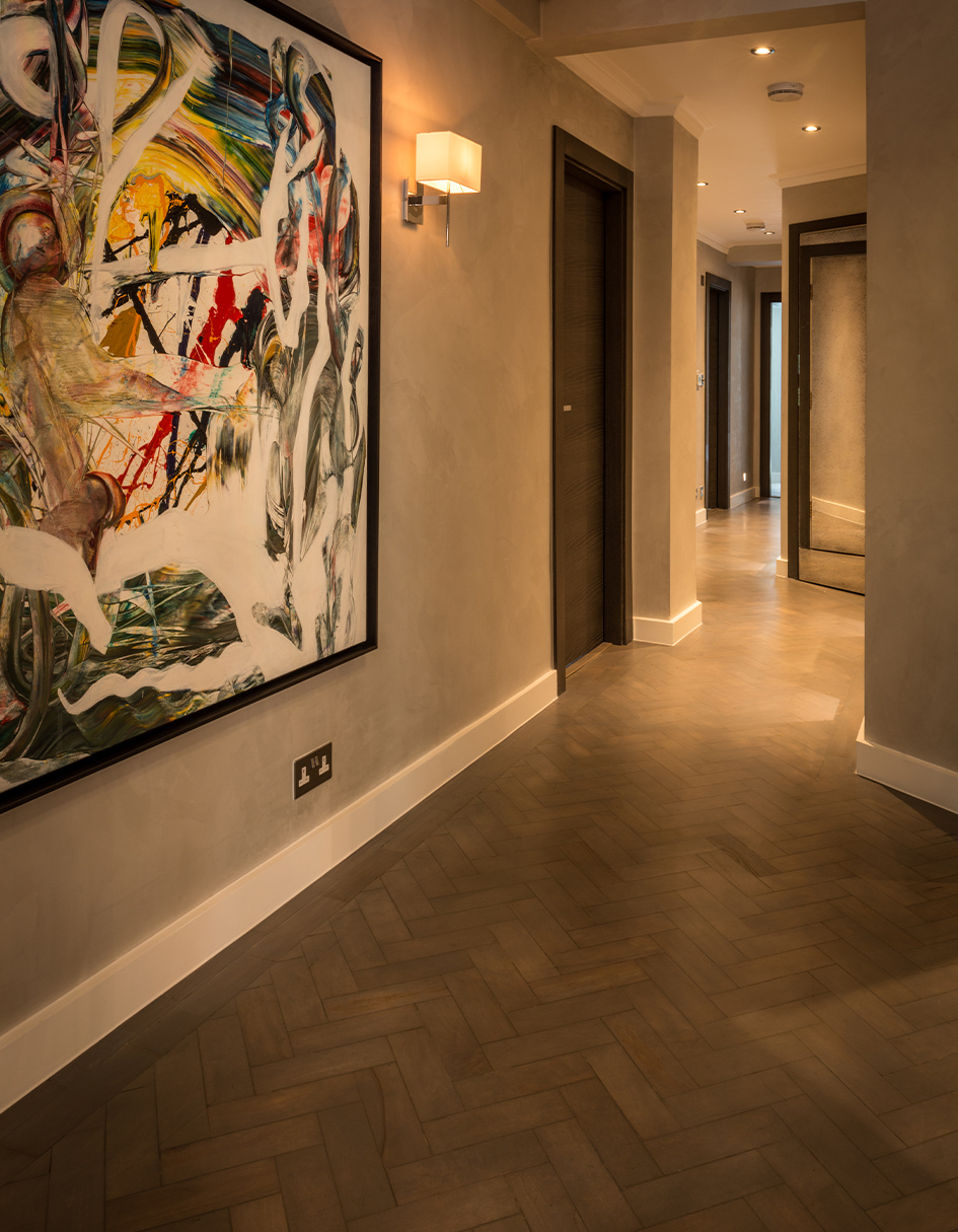 The original parquet floor was repaired, stained and lacquered to complement the grey tones of the polished plastered hallway.