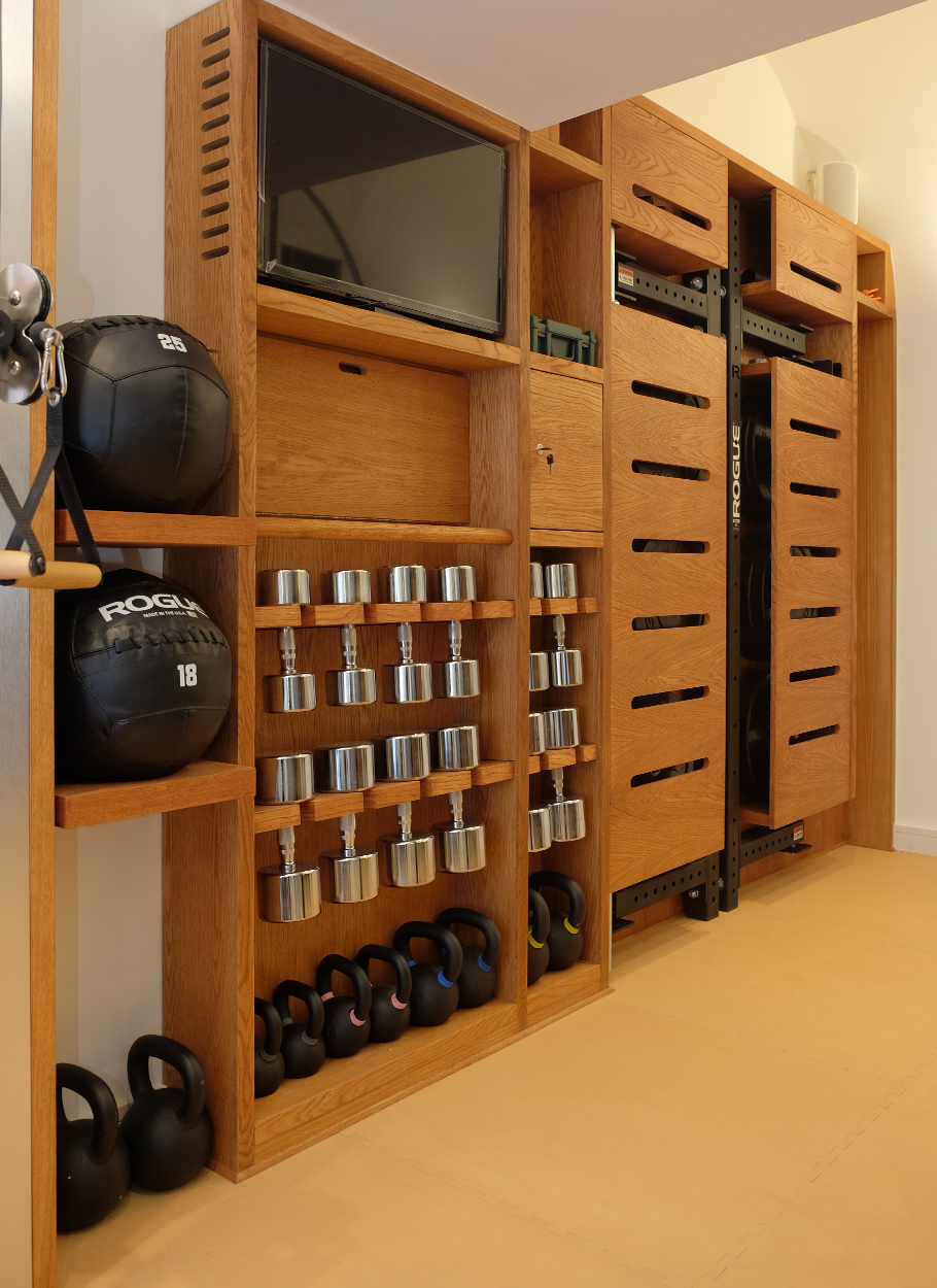 The workout equipment, services and medical kit are all housed in bespoke systems of interconnecting furniture; the natural colour palette and subtle lighting, contrasting against the sleek chrome and black equipment, creates a motivating and energising environment.